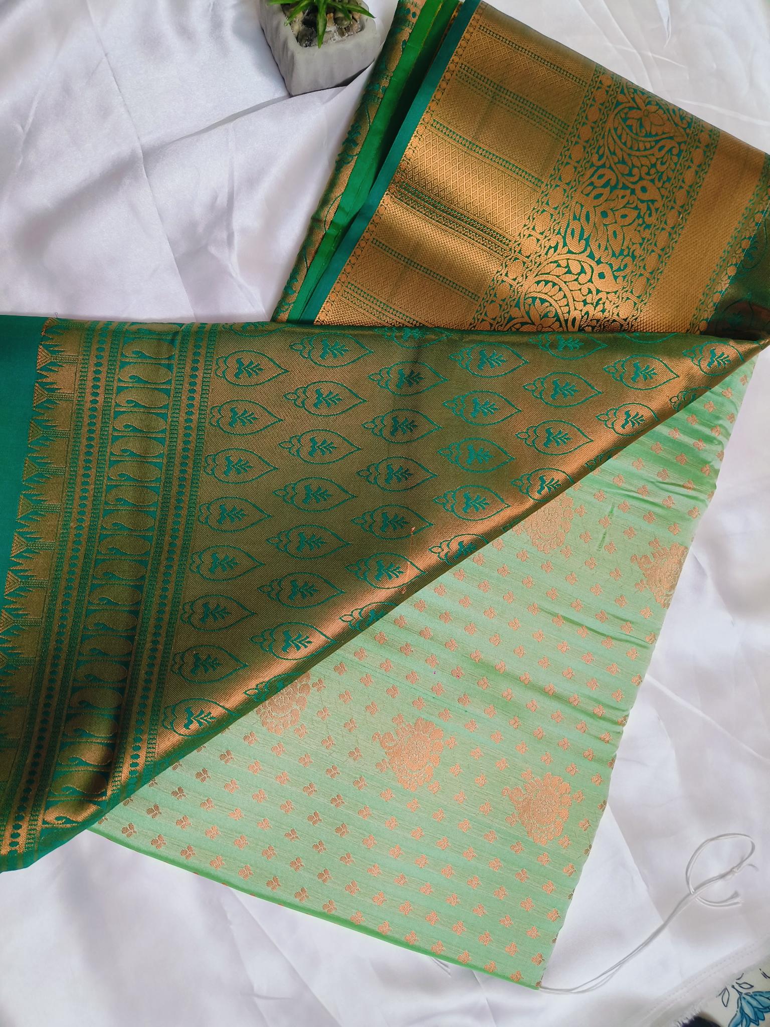 This 6.5-meter Big Border-Silk Green Saree, including the blouse, is designed for an elegant drape that enhances your silhouette. Its rich silk fabric and striking border make it a perfect match for traditional jewelry like jumkas, bangles, and statement necklaces, ideal for any special occasion. To preserve its luxurious texture and vibrant color, dry clean only for the first few washes and avoid machine washing. Elevate your wardrobe with this timeless piece that seamlessly blends classic tradition with refined style.