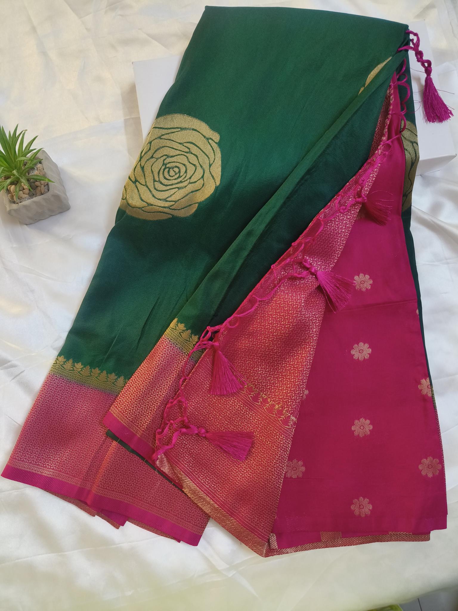 This Chinon Crushed Organza saree in green offers an elegant drape that enhances your silhouette.Ā Embrace a blend of timeless tradition and refined style with this exquisite saree.