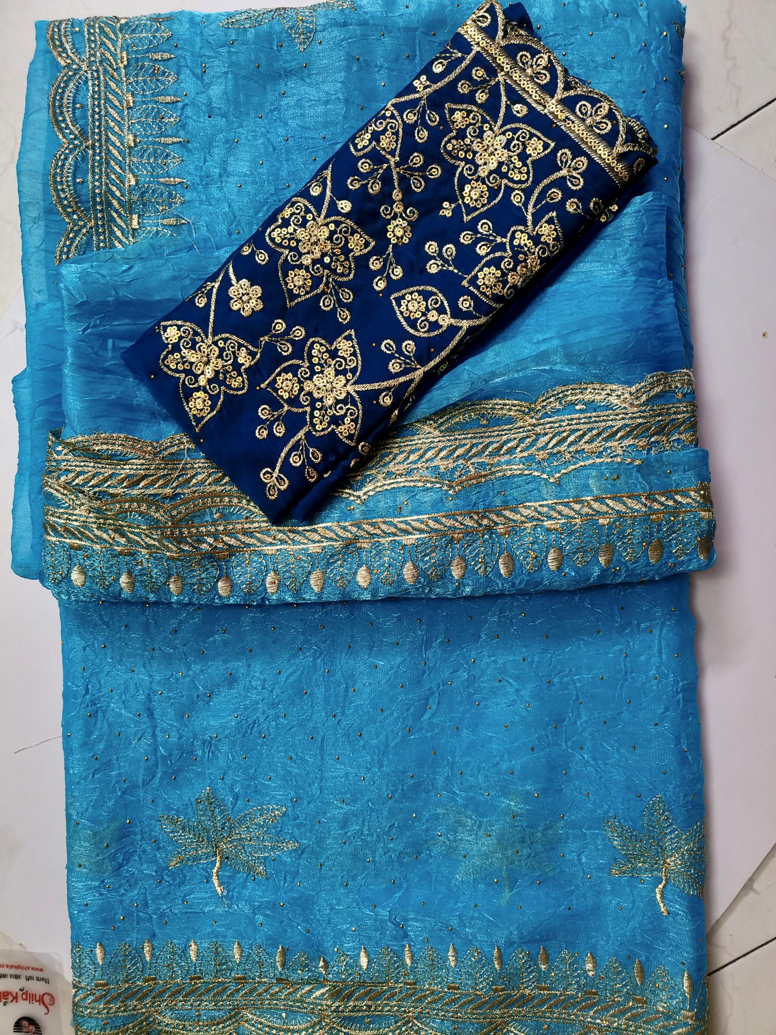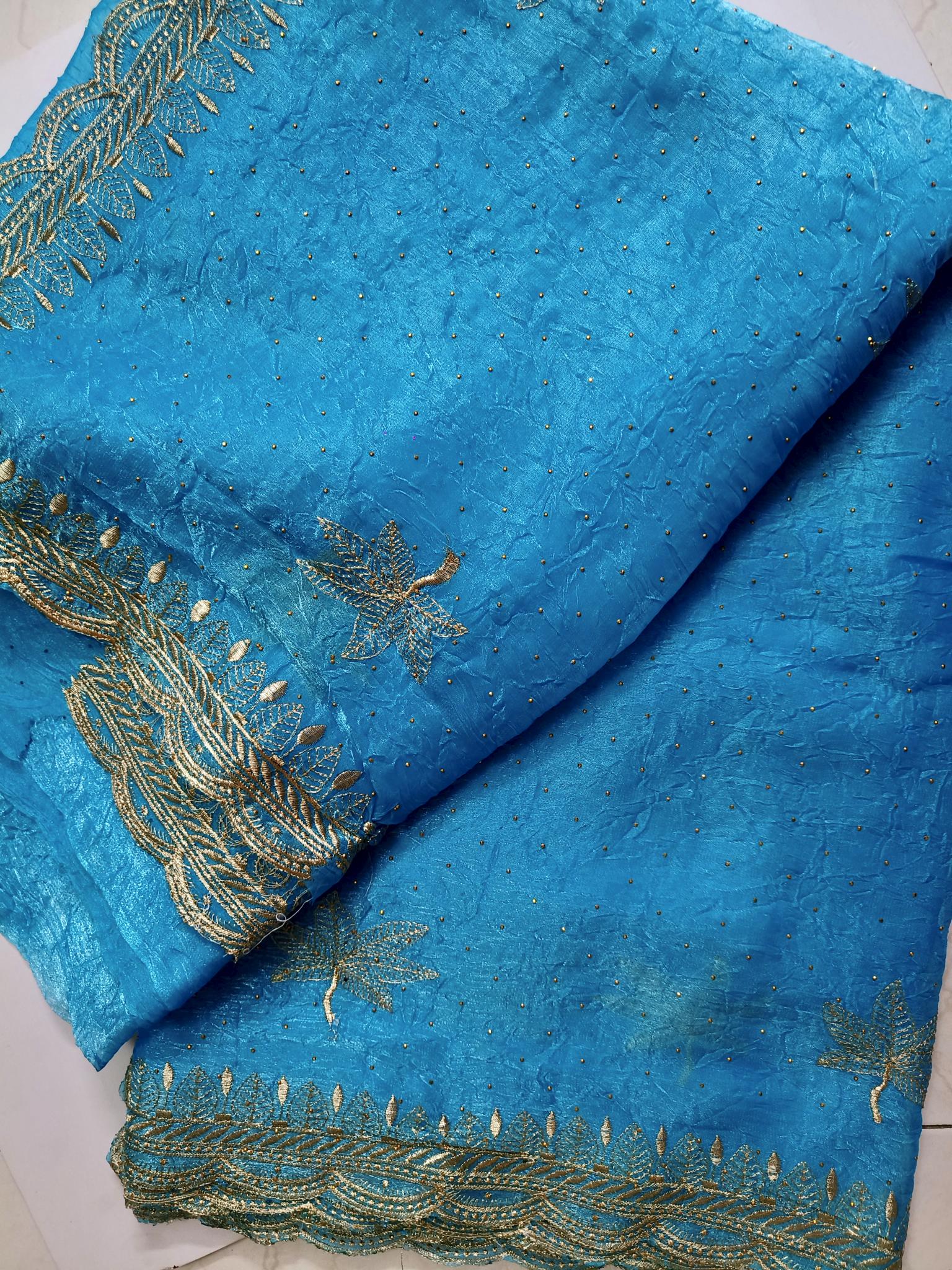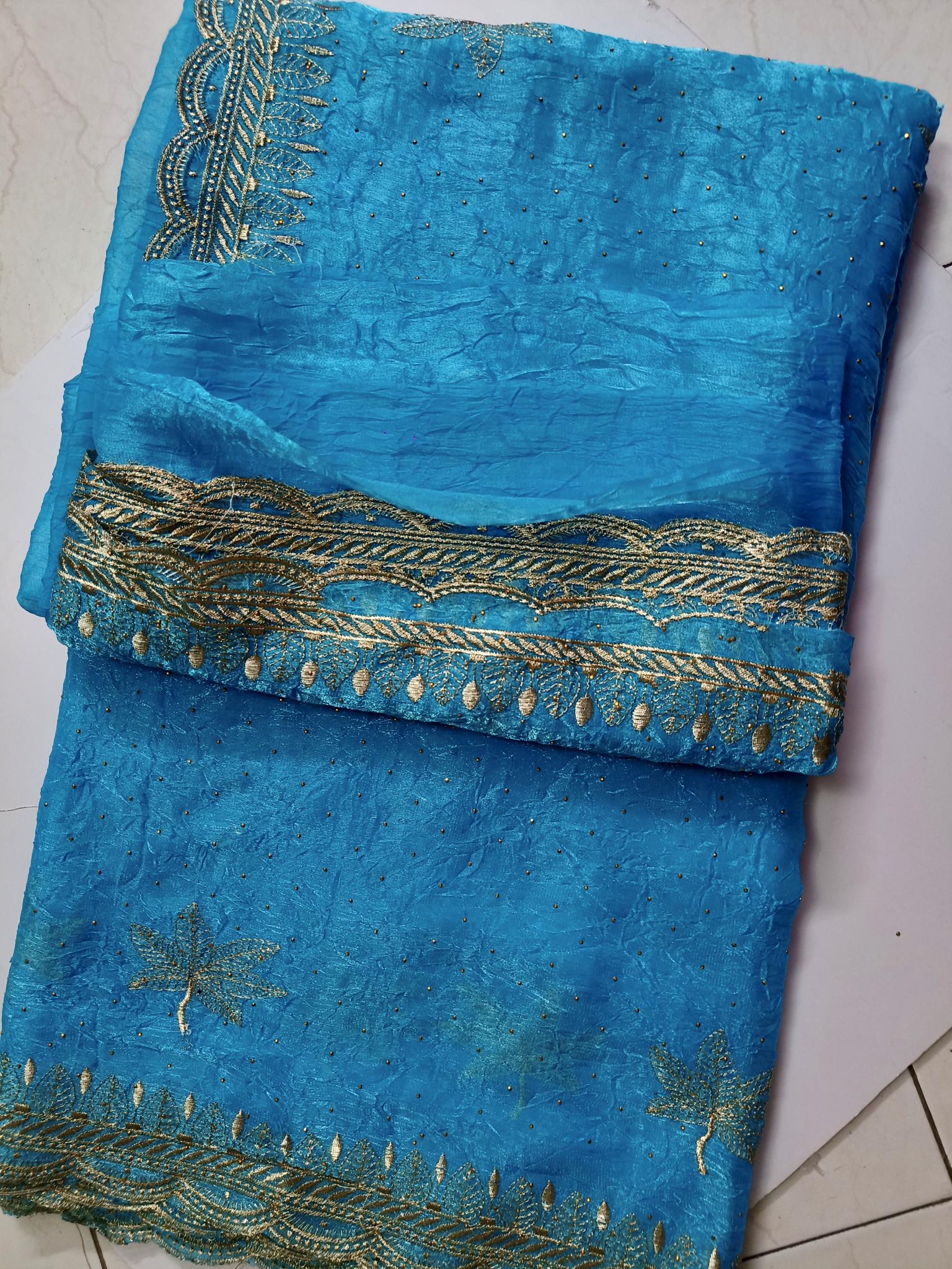 Elevate your elegance with this Sky-Blue Crushed Organza Saree, thoughtfully designed with intricate embroidery work. The lightweight, textured organza fabric offers a graceful drape that enhances your silhouette, while the delicate embroidery adds refined detail for a polished look. Perfect for formal occasions, this saree combines contemporary style with timeless sophistication.