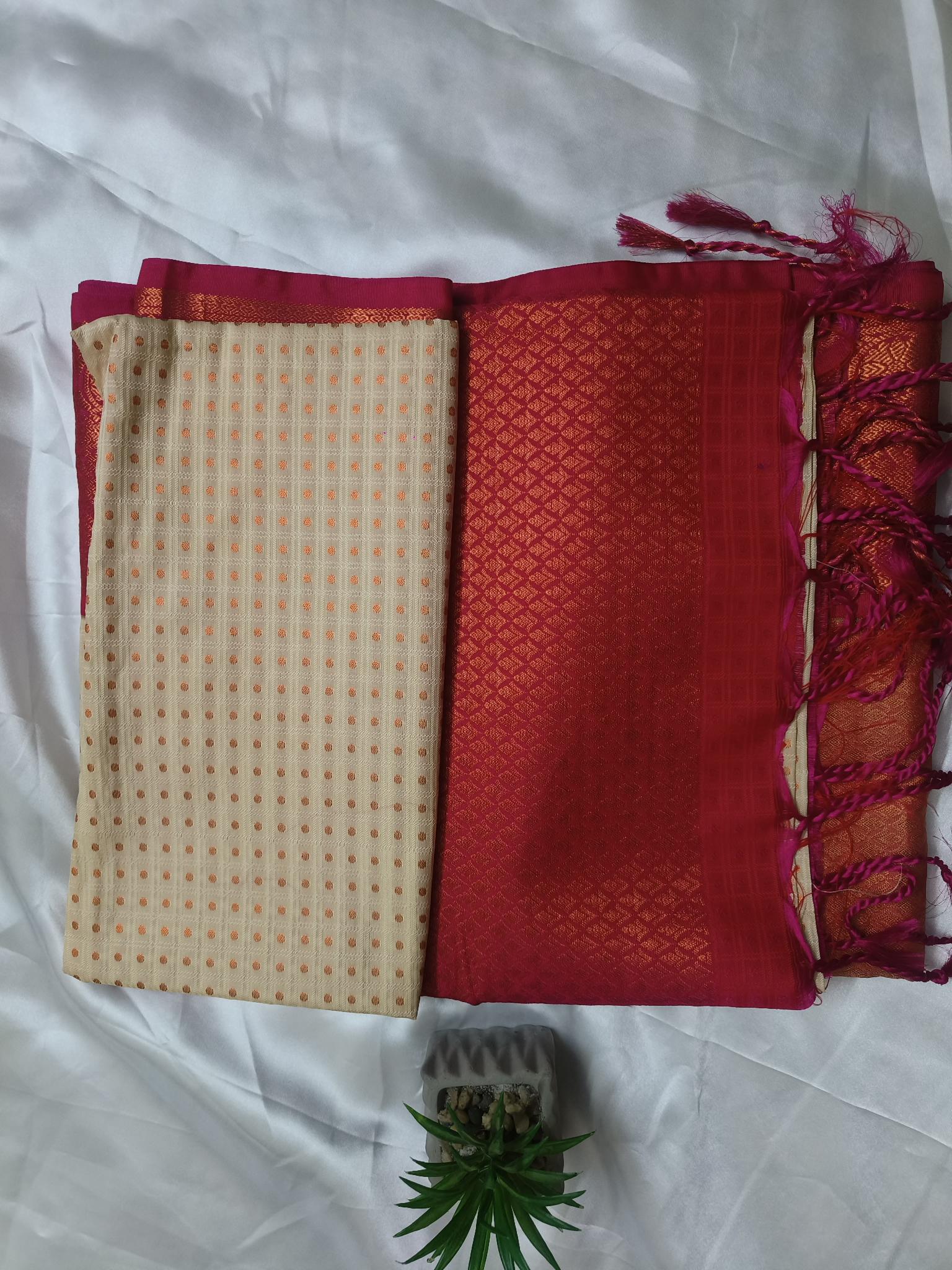 This Kattu Lakshya Butta saree in soft silk white with pink offers an elegant drape that enhances your silhouette. Embrace timeless sophistication with this saree that seamlessly blends tradition and contemporary style.