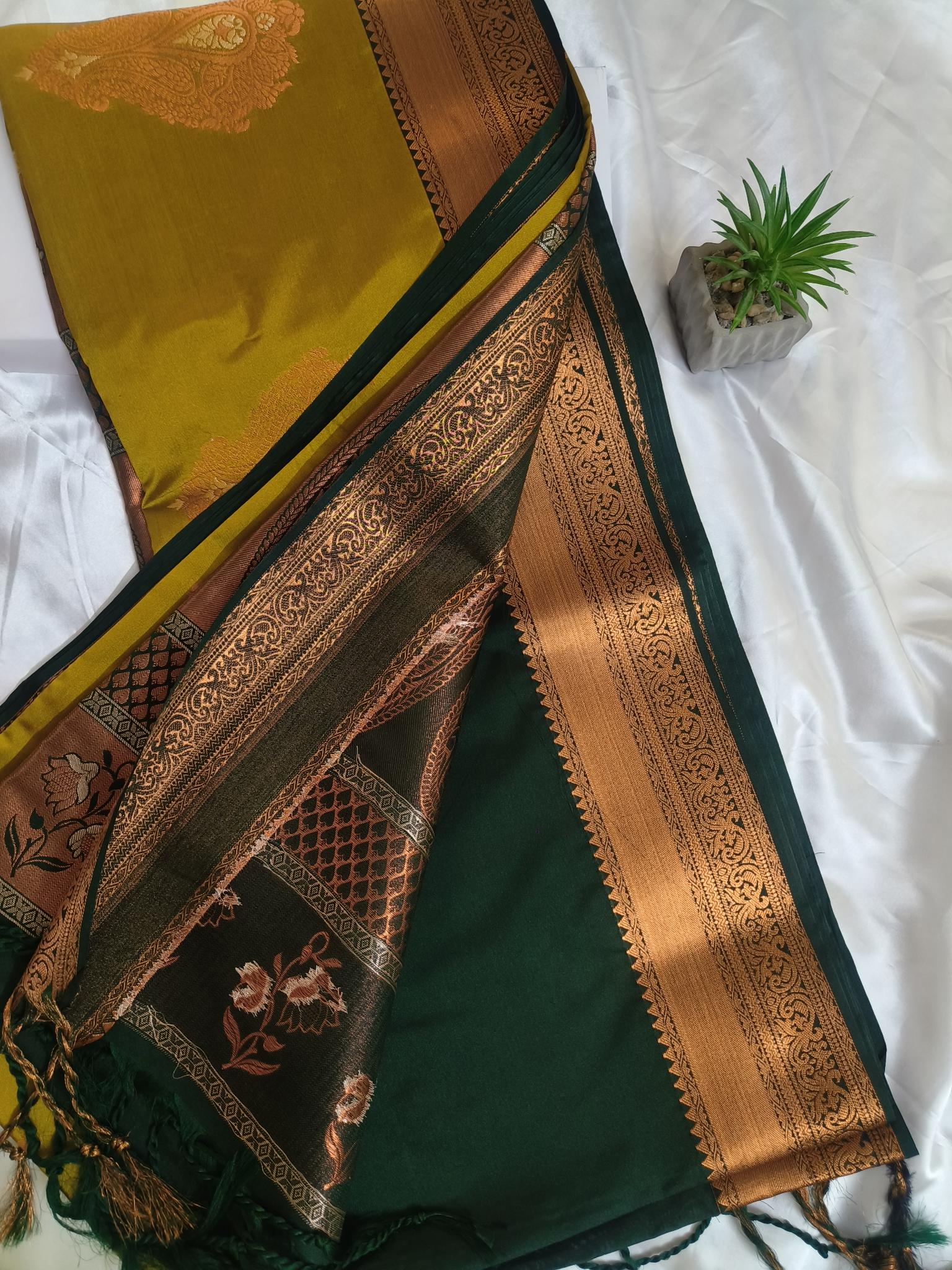 This Meena work semi-silk Mustard Yellow saree offers an elegant drape that enhances your silhouette. Its delicate craftsmanship pairs beautifully with traditional accessories like jumkas, bangles, and a statement necklace, perfect for any special occasion.