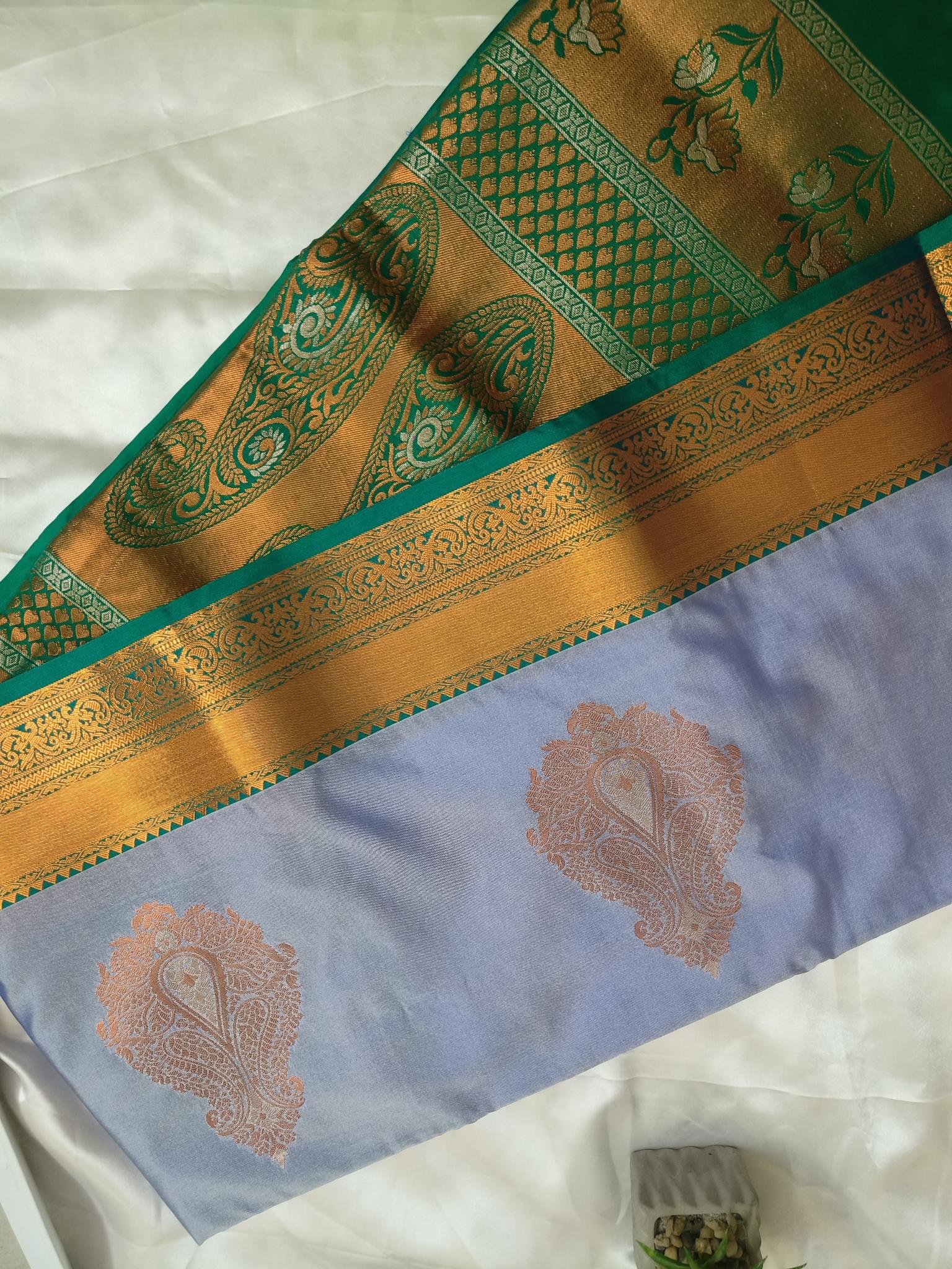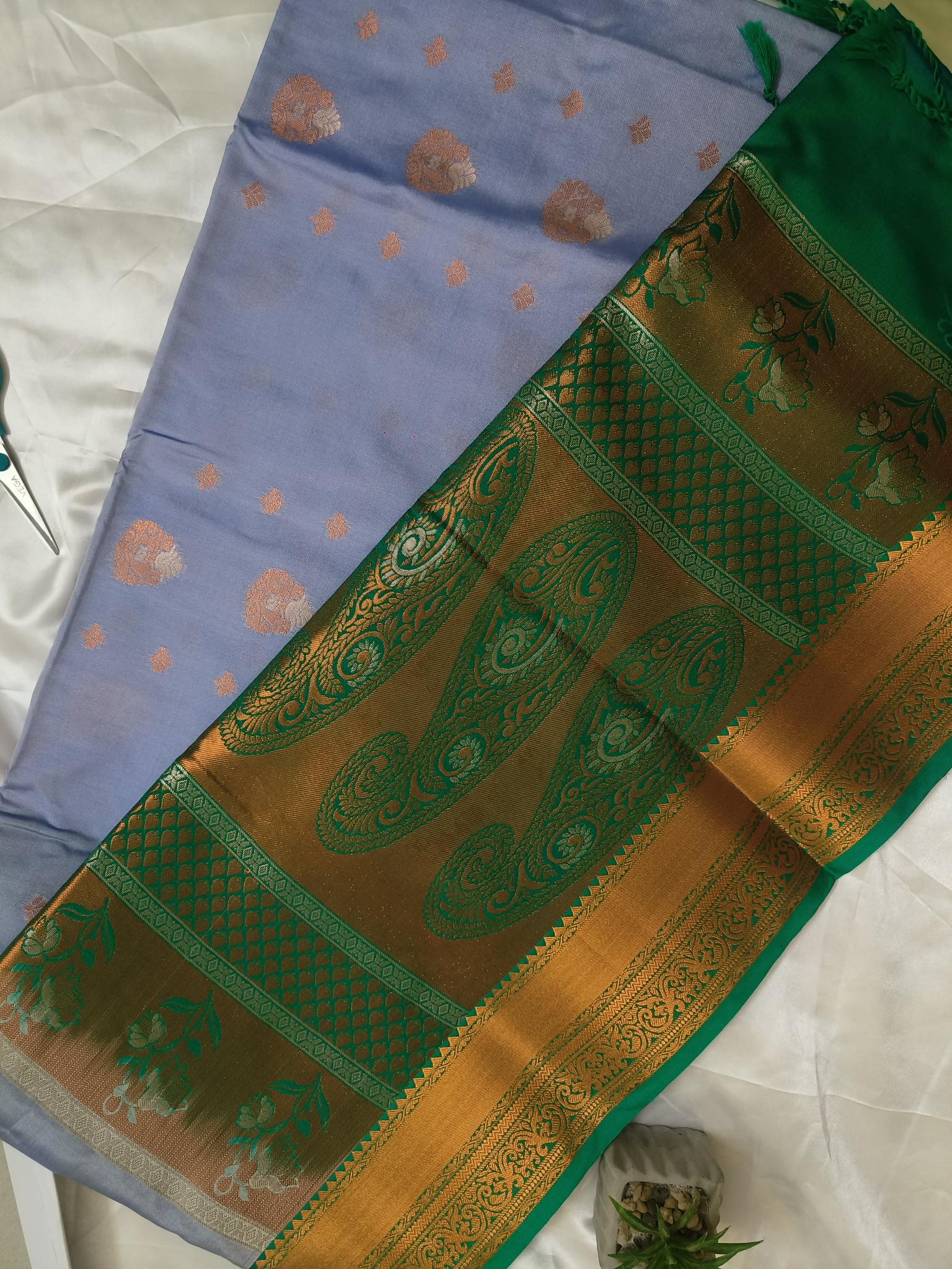 This Meena work semi-silk lavender saree offers an elegant drape that enhances your silhouette. Its delicate craftsmanship pairs beautifully with traditional accessories like jumkas, bangles, and a statement necklace, perfect for any occasion.