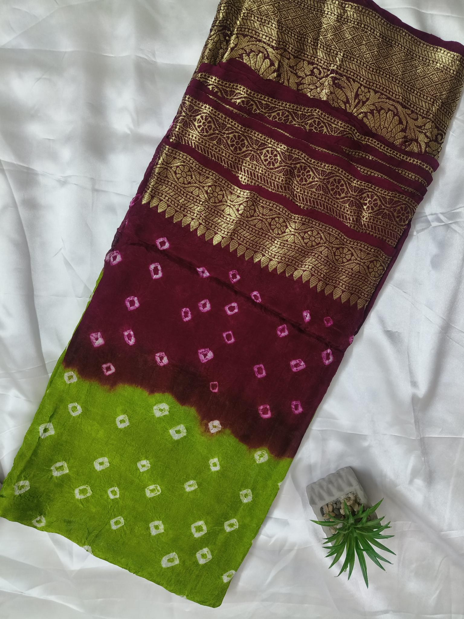 Experience the timeless elegance of the Pure Bandhej Silk Saree, this exquisite saree is perfect for special occasions when paired with jumkas, bangles, and a statement neckpiece.Ā