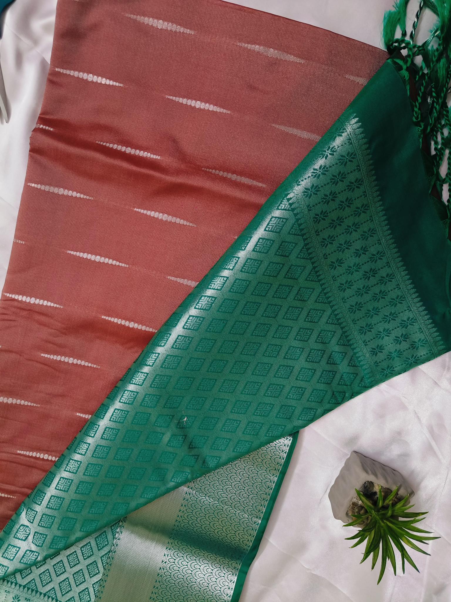 This 6.5-meter Rain Drop Pure Soft Silk Rust Brown Saree, including the blouse, offers an elegant drape that enhances your silhouette. Its rich rust brown hue complements traditional jewelry like jumkas, bangles, and statement necklaces, perfect for any special occasion. Crafted for lasting beauty, it requires dry cleaning for the first few washes and should be kept away from machine washing. Elevate your wardrobe with this timeless piece that seamlessly blends classic tradition with refined style.