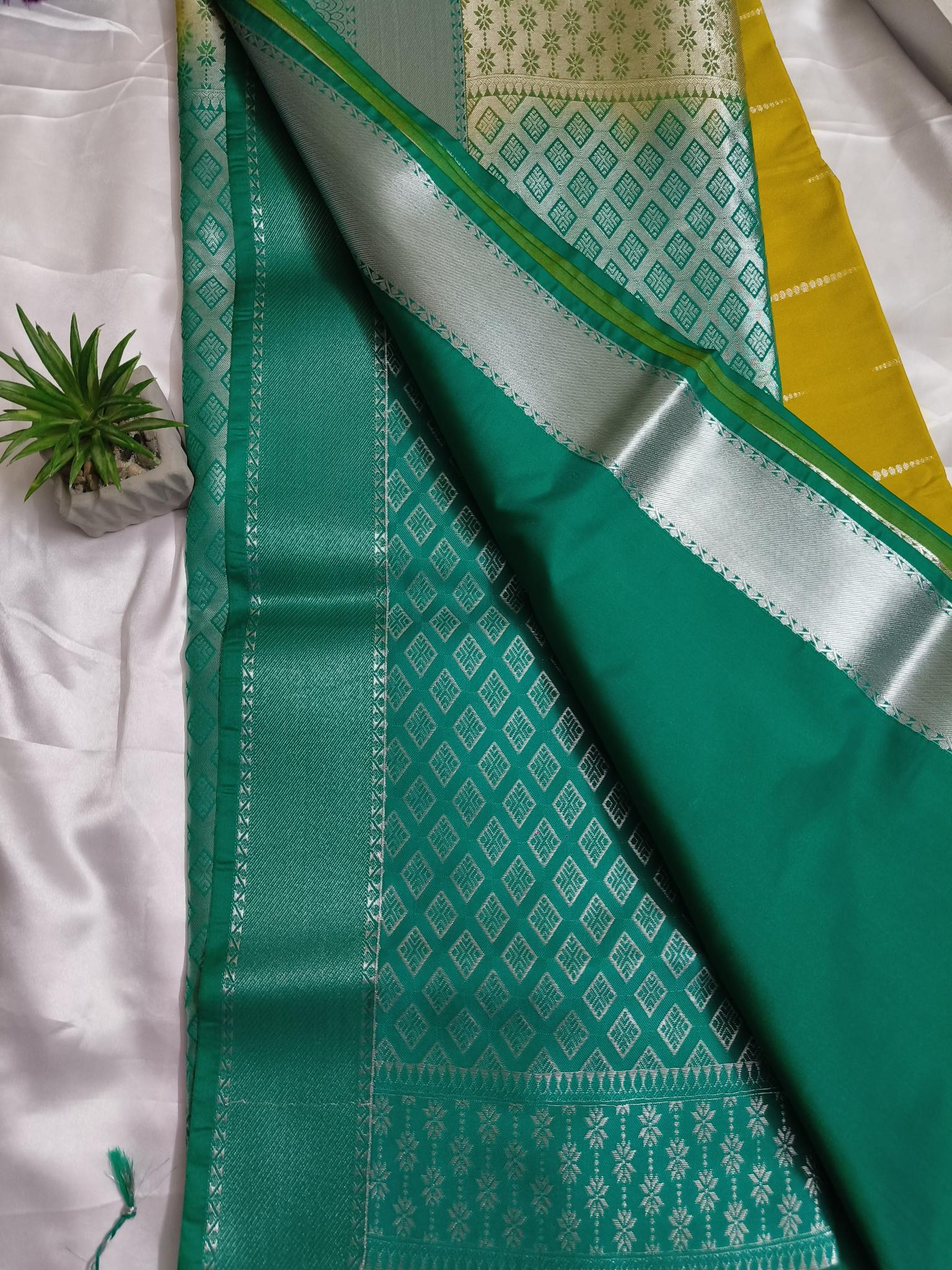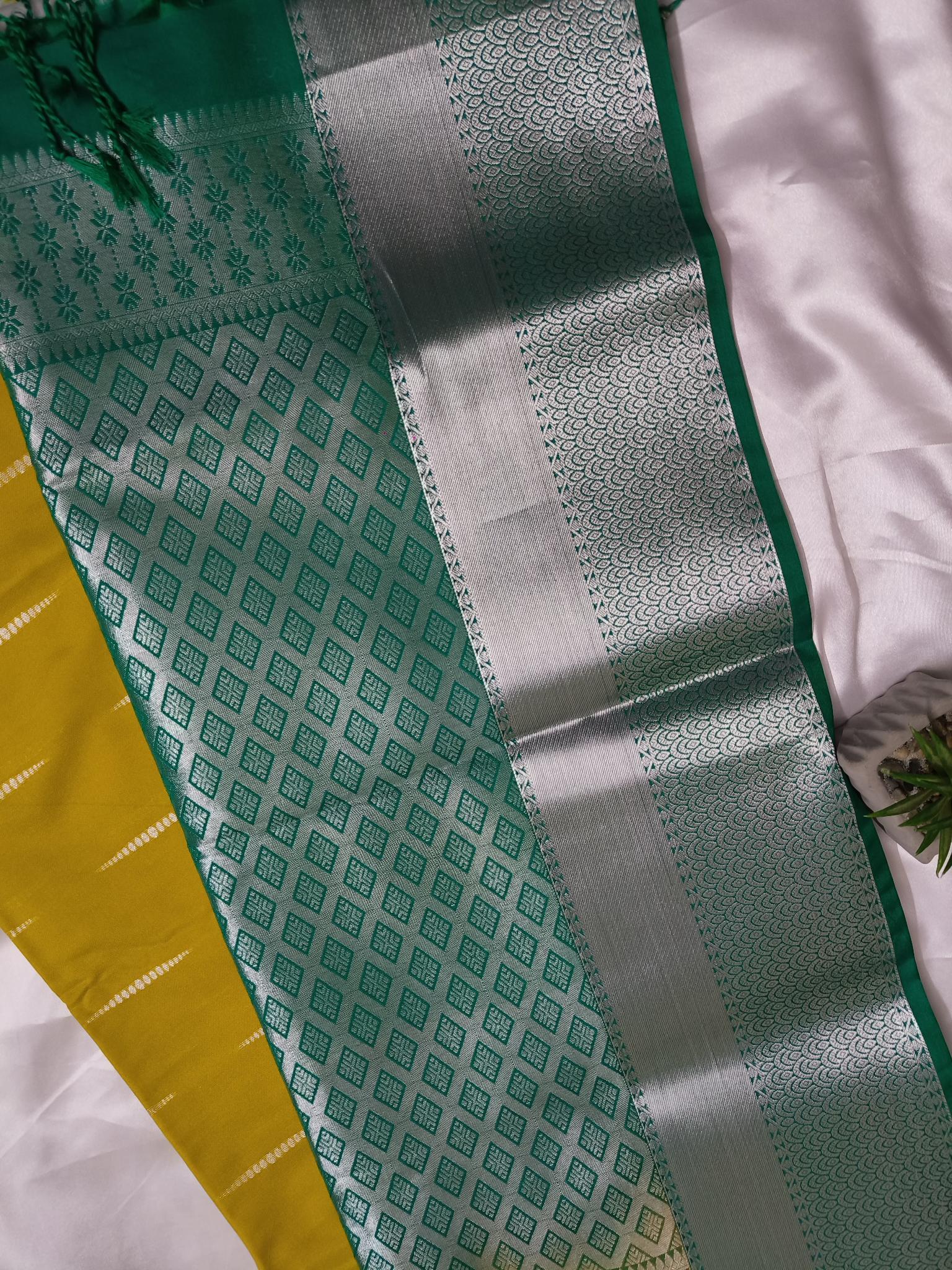 This Rain Drop Pure Soft Silk Yellow Silver Border Saree offers an elegant drape that enhances your silhouette. Embrace timeless sophistication with this saree that seamlessly blends classic charm and contemporary style.
