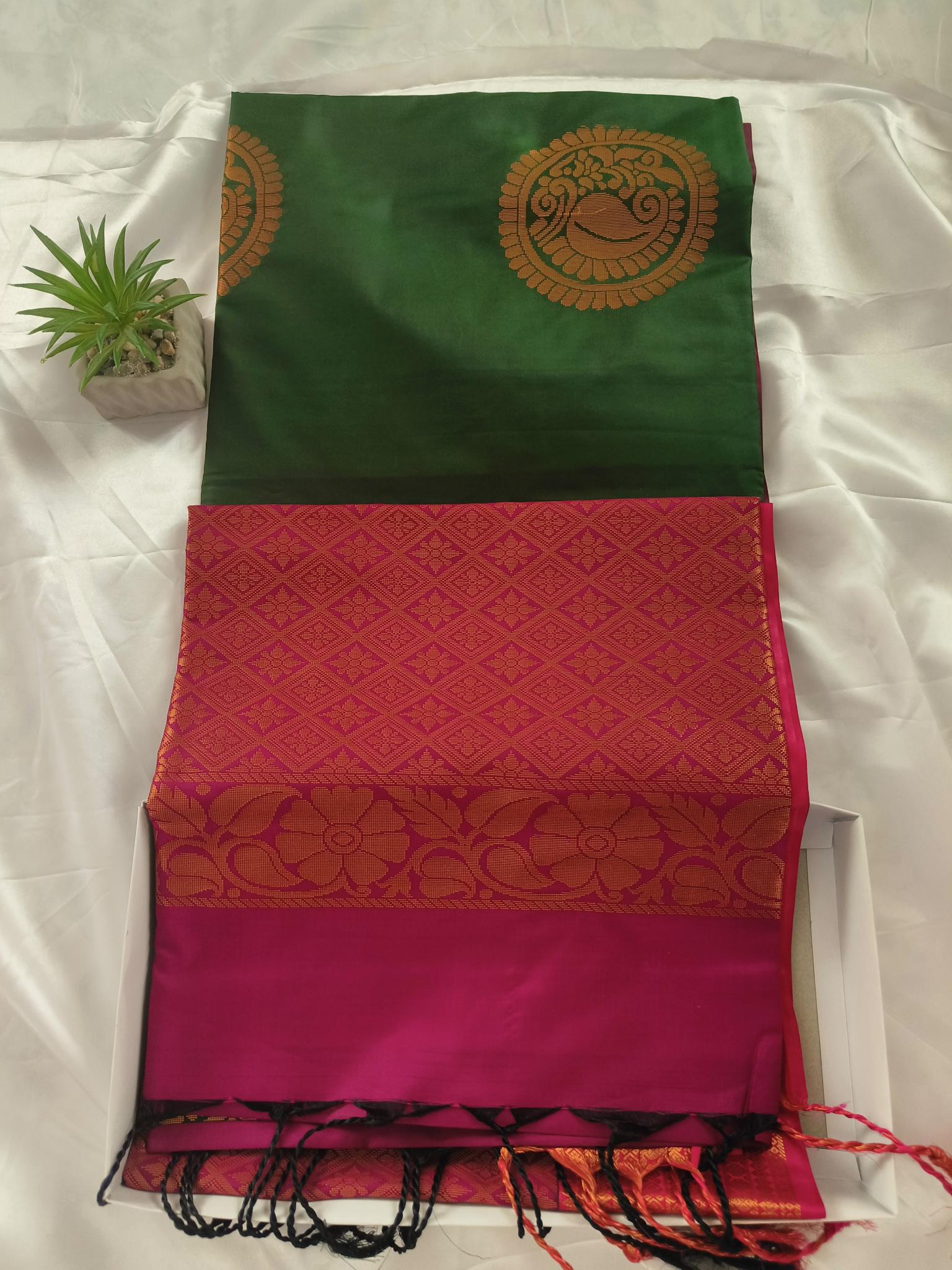 Elevate your elegance with this Soft Silk Green Saree, crafted to offer a smooth, lustrous finish that drapes gracefully. Its rich green hue complements a refined style, perfect for formal occasions or festive celebrations. Experience comfort and sophistication in one exquisite ensemble.